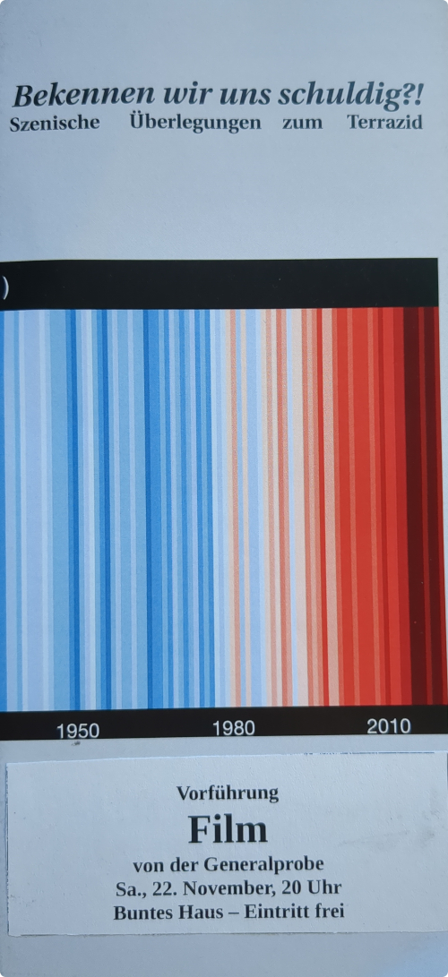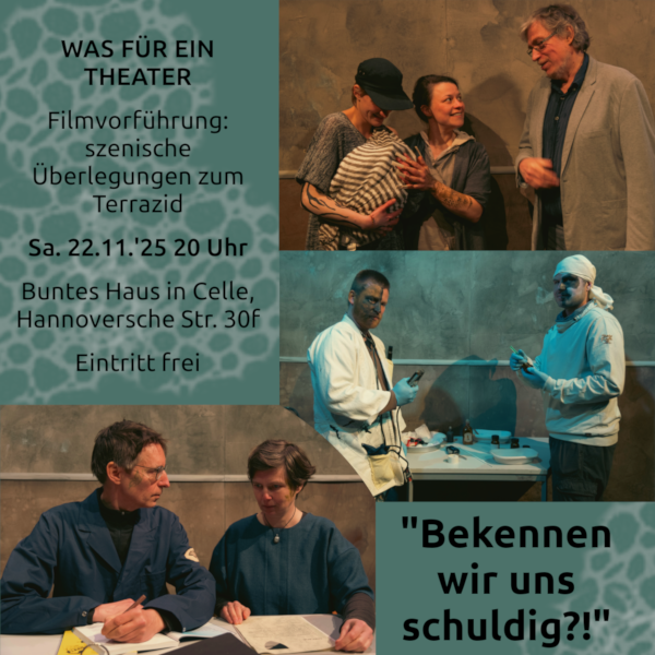 „Szenische Überlegungen zum Terrazid“ war der Untertitel eines Theaterprojekts, das im Mai 2024 zwei ausverkaufte Vorstellungen im Bunten Haus hatte. Zu einer „Wiederaufnahme“ kam es aus Krankheitsgründen leider nicht. Jetzt aber gibt es einmalig im Bunten Haus eine Filmfassung von der Generalprobe.